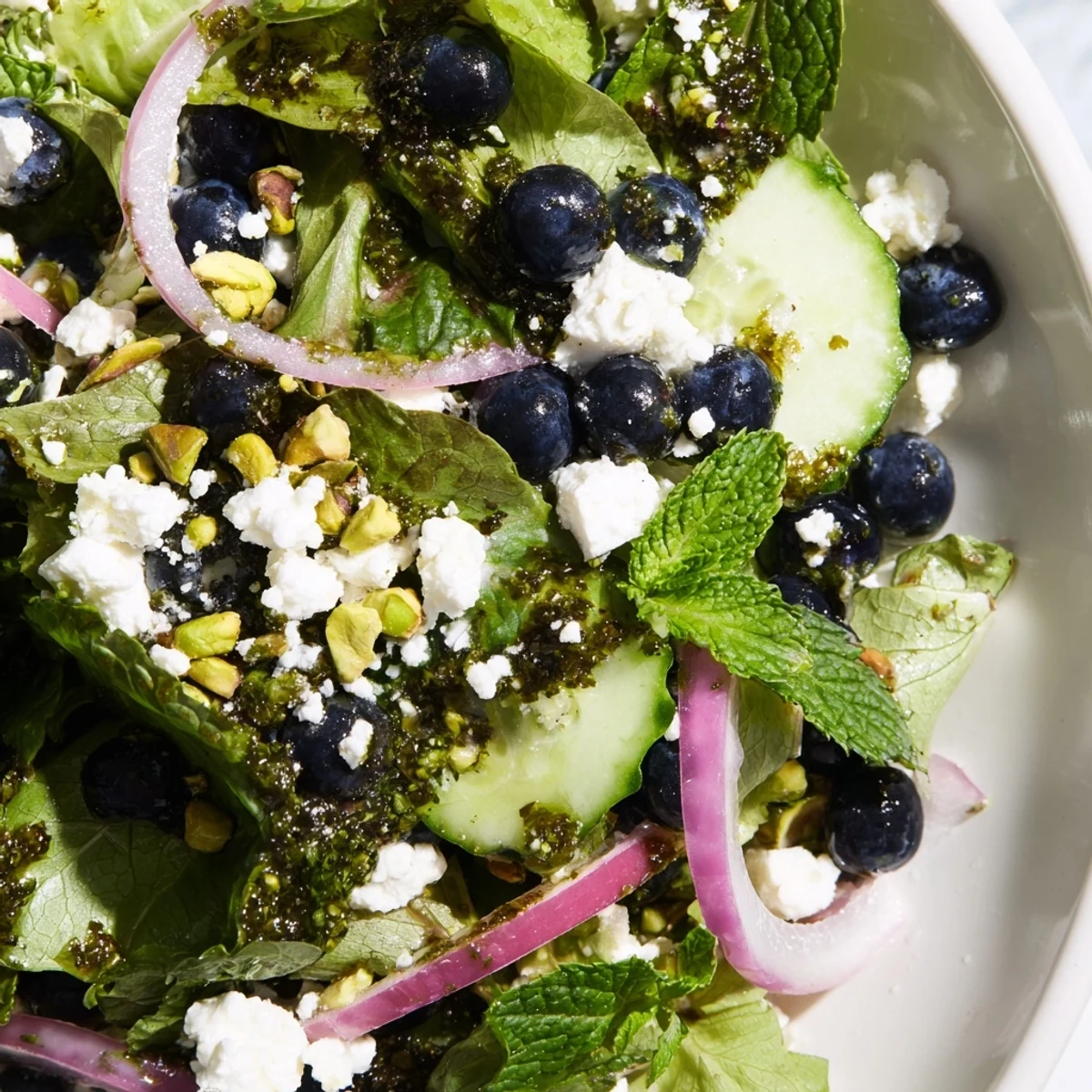 - In a large salad bowl, gently combine the spring mix, blueberries, cucumber, red onion, mint, and crumbled feta cheese