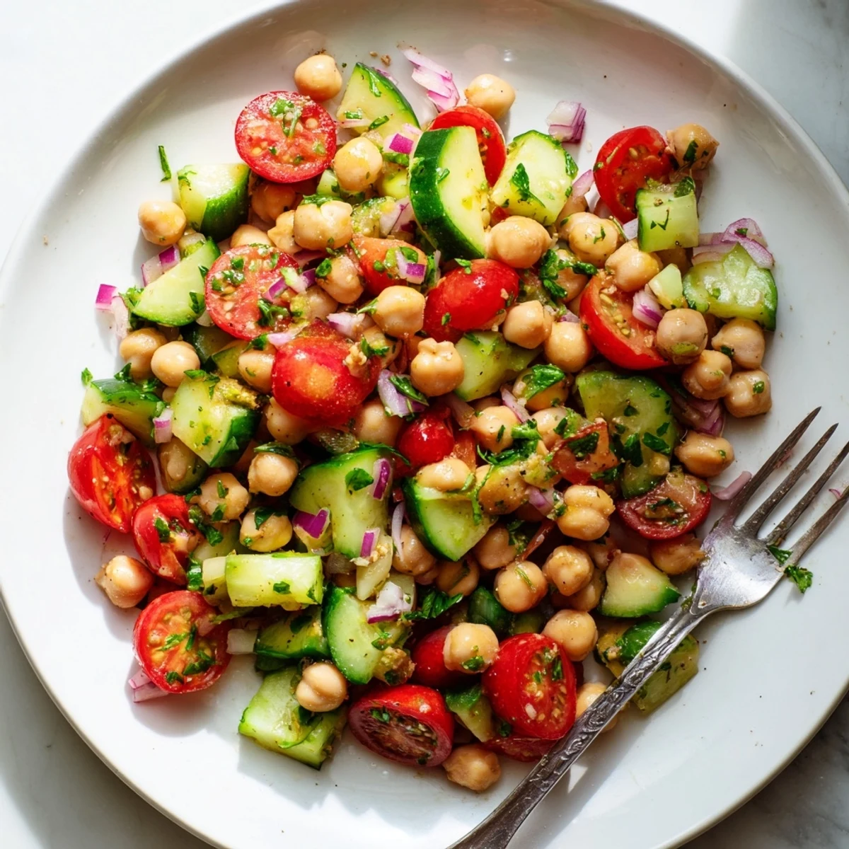 This vibrant Mediterranean bowl brings together protein-rich chickpeas with cool cucumber and sweet cherry tomatoes, all tossed in a bright lemon-garlic dressing. The fresh herbs add a fragrant finish while the crisp vegetables provide satisfying crunch. Ready in just 15 minutes with no cooking required.