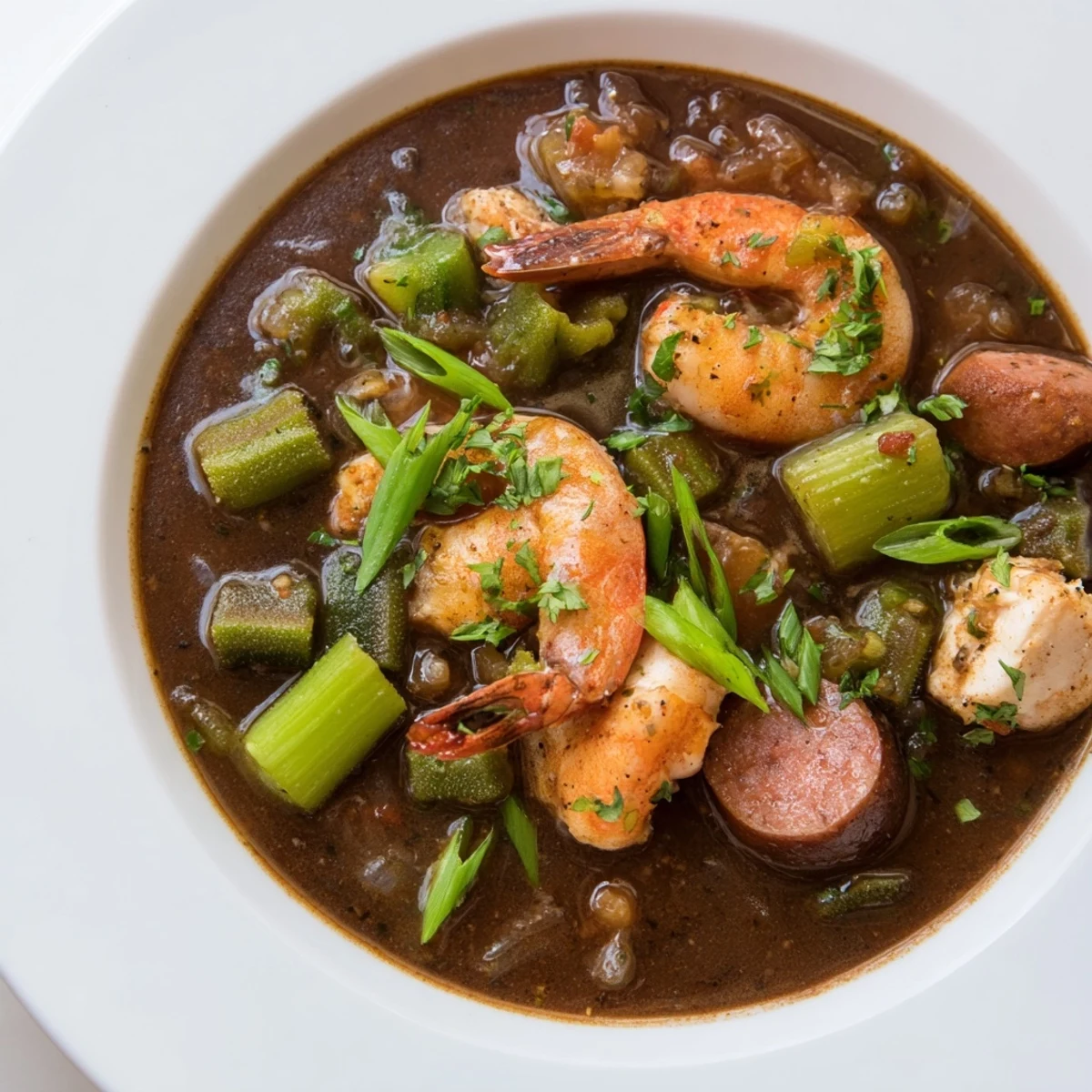 This hearty Creole seafood gumbo features succulent shrimp, lump crabmeat, and firm white fish simmered with smoky andouille sausage and fresh okra. A deeply spiced roux forms the base, complemented by diced tomatoes, bell pepper, celery, and aromatic seasonings. Simmered slowly to meld flavors, it’s served hot over white rice and garnished with green onions and parsley for a true taste of Louisiana’s bayou-style cooking.