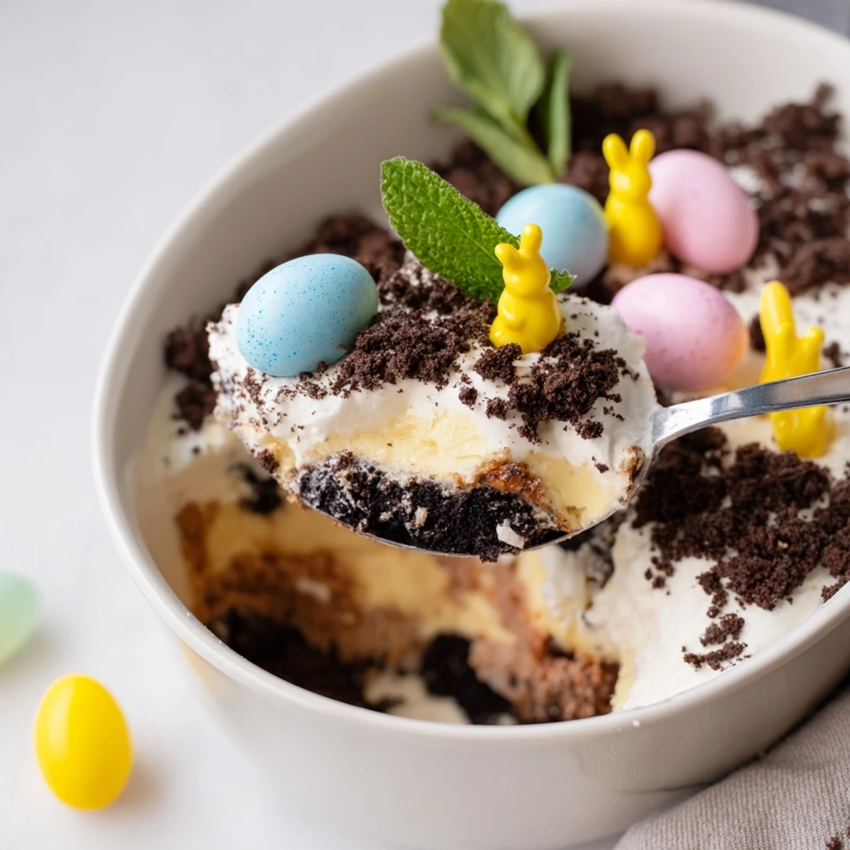 What makes this dessert special is its interactive presentation. Guests can dig for hidden candy treasures beneath the cookie dirt, making it especially engaging for children during Easter gatherings. The combination of rich chocolate, tangy cream cheese, and light vanilla pudding offers satisfying variety in every bite.