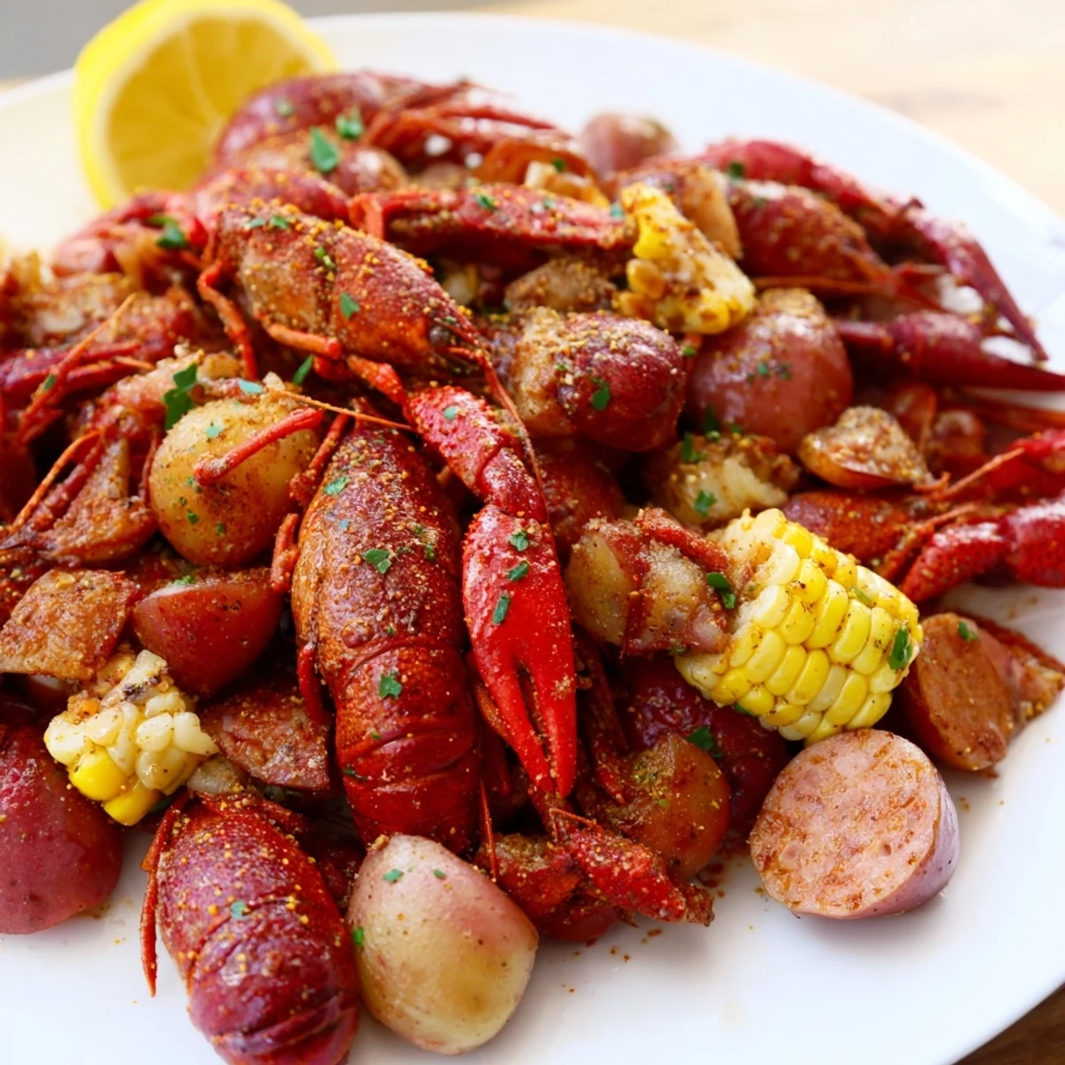 This Louisiana-style crawfish boil brings together spicy crawfish, tender red potatoes, sweet corn, and smoky sausage cooked in a deeply seasoned broth. Aromatics like garlic, onions, lemon, and Cajun spices infuse the cooking liquid, enhancing each ingredient's natural flavors. After boiling, the dish rests to soak in the spices fully, delivering bold, authentic Southern flavors. Perfect for sharing, this hearty combination captures a festive and comforting cooking tradition.