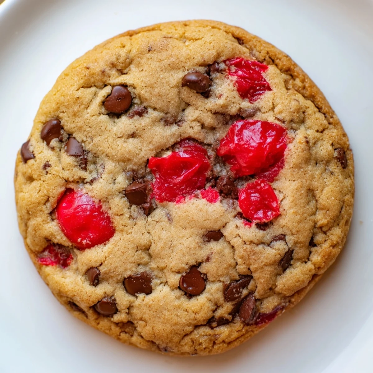 These soft, chewy vanilla-butter cookies feature a delightful combination of sweet maraschino cherries and semi-sweet chocolate chips. The cherries add vibrant red color and fruity sweetness that balances perfectly with rich chocolate morsels.