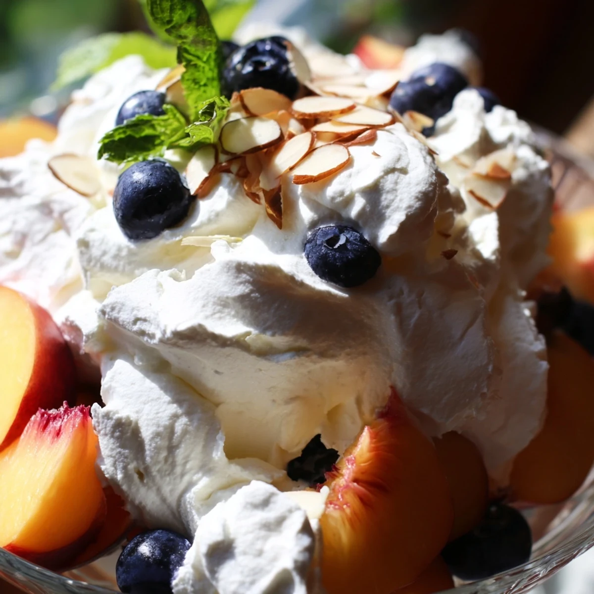 Fresh mint leaves add a bright, aromatic finish while optional blueberries bring color and extra sweetness. Sliced almonds provide a delightful crunch if desired. Perfect for warm weather gatherings, this impressive yet simple dessert comes together in just 15 minutes and can be made ahead.