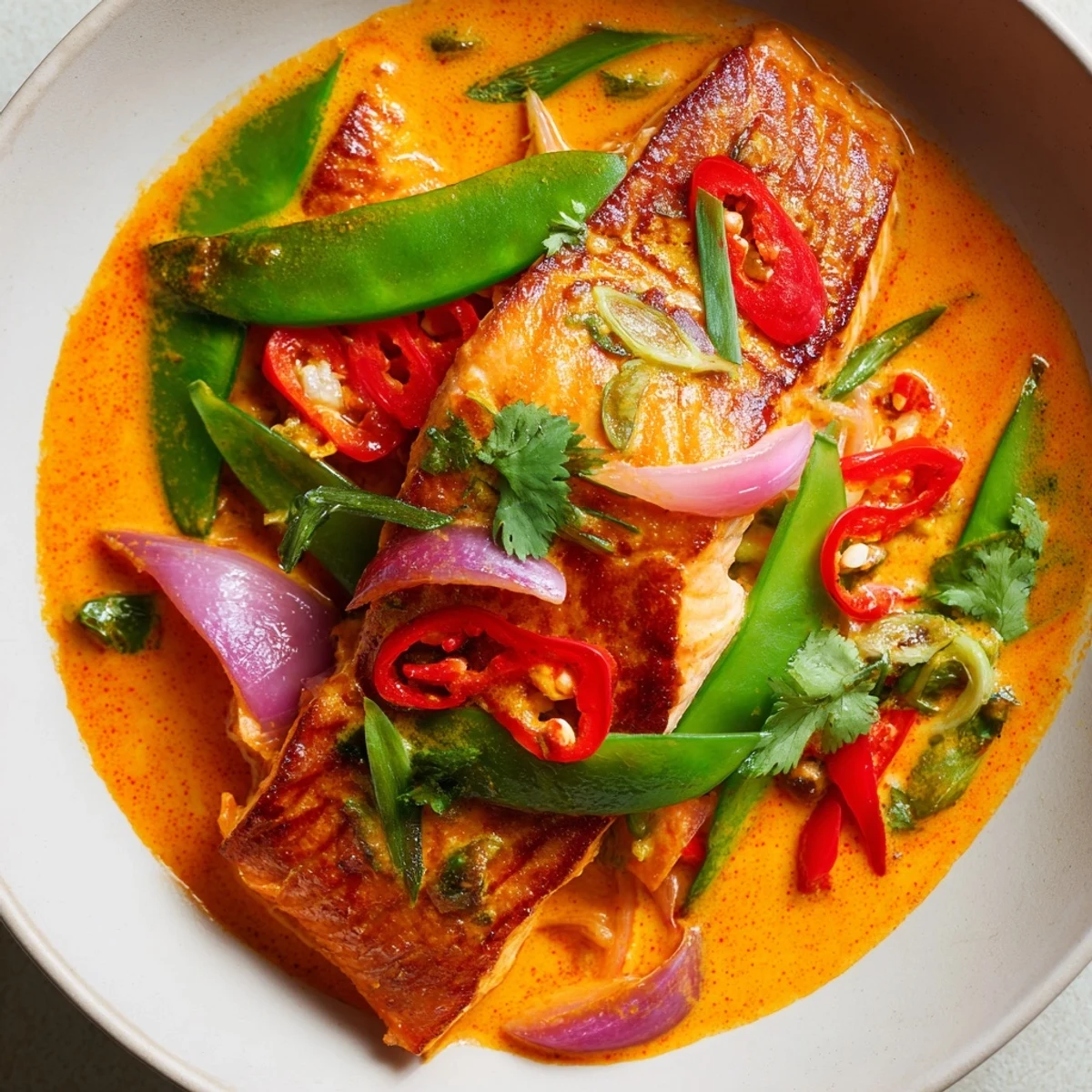 This vibrant Thai-inspired dish features succulent salmon fillets poached in a creamy red curry coconut sauce. Aromatic curry paste combines with rich coconut milk, tangy lime, and savory fish sauce to create a luxurious braising liquid. Fresh vegetables including red bell pepper, sugar snap peas, and red onion add color and crunch to the dish. Finished with generous handfuls of fresh coriander and optional spicy red chilies, this one-skillet meal comes together in just 35 minutes. The salmon cooks gently in the simmering sauce, keeping it moist and flaky while absorbing all the complex flavors. Serve over fluffy jasmine rice to soak up every drop of the fragrant sauce.